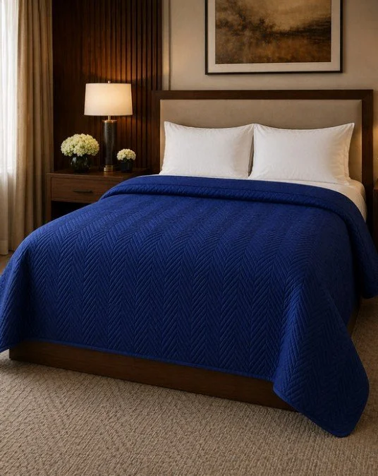 Our new commercial grade blue/grey reversible comforter is a great choice for your property. Now in stock for immediate shipment. Available in Twin, Double, and Queen