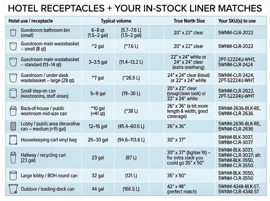 True North carries a full inventory of black and translucent can liners in the most popular sizes for your hotel!