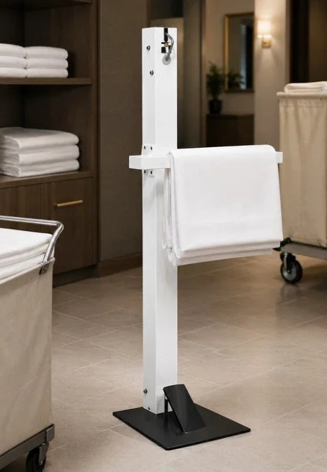 The bed sheet folding assistant provides you with an extra hand. One person can fold 100 to 120 no-iron sheets per hour. Instructions are included. All-steel construction, with blue baked-enamel finish. 12" x 15" base.