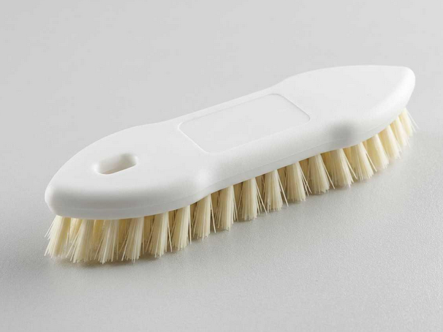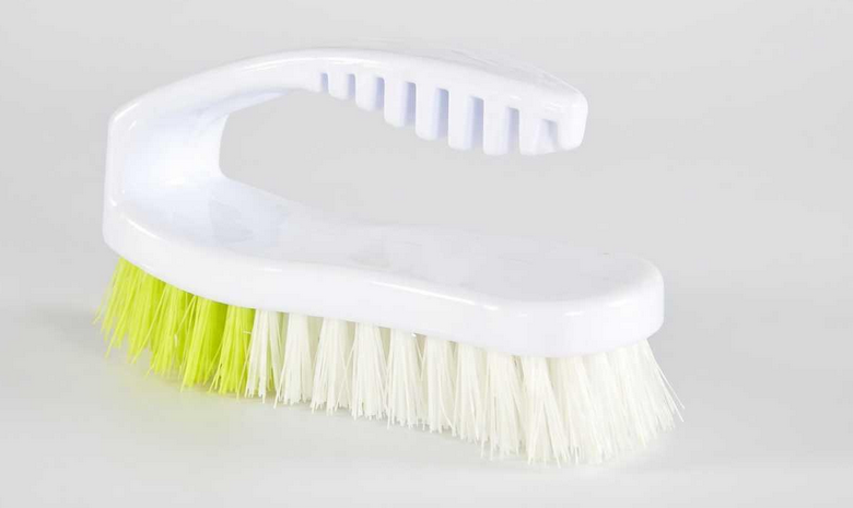Scrub brush with iron design has an ergonomic handle for grip when scrubbing in light- to medium-duty applications